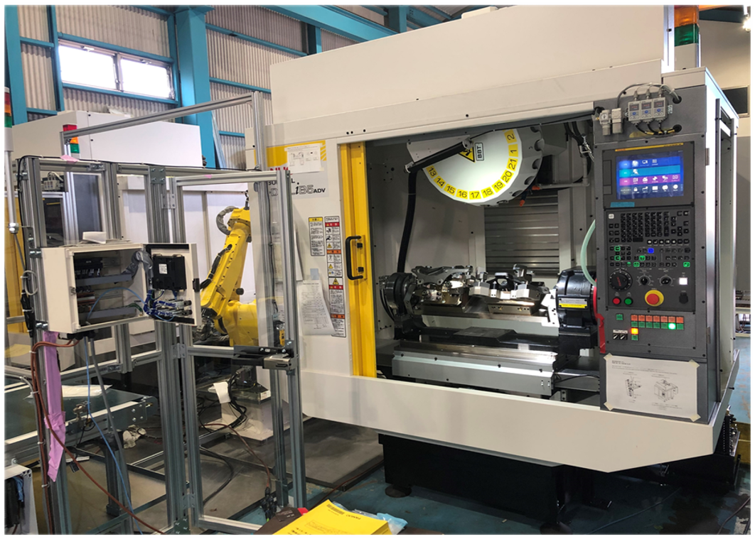 多軸ロボットを使用して、加工機へワークの供給・排出を行います